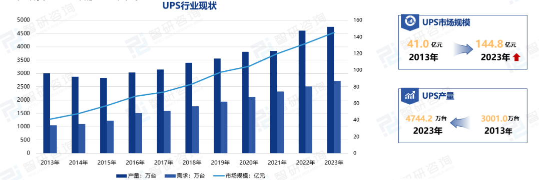 過去UPS主要應(yīng)用于工業(yè)制造領(lǐng)域,信息化建設(shè)拓寬UPS的應(yīng)用范圍,隨著信息化廣泛應(yīng)用于金融、教育、農(nóng)業(yè)、軍工、新能源、電力等多個(gè)領(lǐng)域,以UPS為核心的數(shù)據(jù)中心產(chǎn)品市場(chǎng)需求不斷擴(kuò)大。隨著全國(guó)性和區(qū)域性的綜合交通網(wǎng)基礎(chǔ)設(shè)施和物流需求的增加,交通總投資必然繼續(xù)保持增加,加之一帶一路、互聯(lián)互通、海外援建將帶來大量高端電源裝備的出口等,對(duì)高端電源裝備市場(chǎng)促進(jìn)較為明顯。隨著各行各業(yè)對(duì)電力安全、電能質(zhì)量及電能智慧管控等需求的不斷增長(zhǎng),我國(guó)UPS行業(yè)市場(chǎng)規(guī)模迎來穩(wěn)步增長(zhǎng),2023年我國(guó)UPS產(chǎn)量達(dá)到4744.2萬臺(tái),需求量為2713.1萬臺(tái),市場(chǎng)規(guī)模144.8億元。